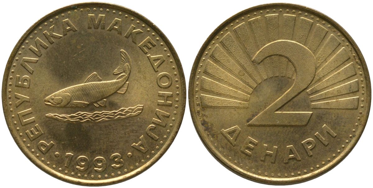 Македония 2 денара 1993 KM 3 латунь 4551-651