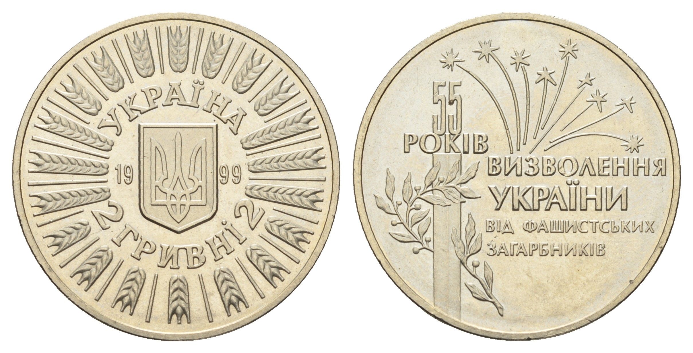 Украина 2 гривны 1999 55 лет освобождению Украины от фашистских захватчиков KM 79 нейзильбер BU 1524-1422