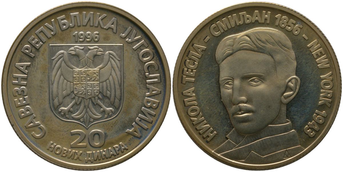 Югославия 20 динаров 1996 140 лет со дня рождения Николы Тесла KM 169 медь цинк никель PROOF 4587-922