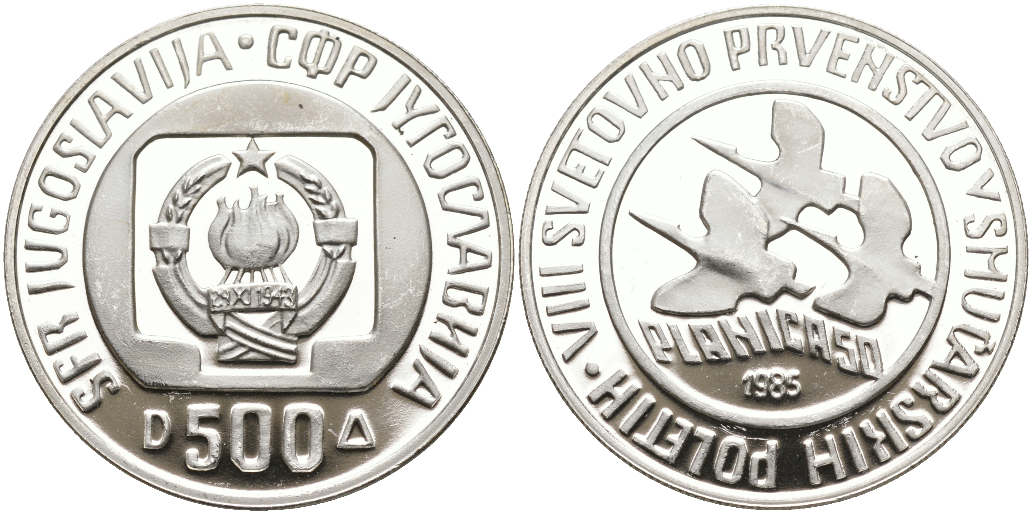 Югославия 500 динаров 1985 чемпионат мира по прыжкам с трамплина в Планице 1985 года KM 116 серебро PROOF 1096-1-42