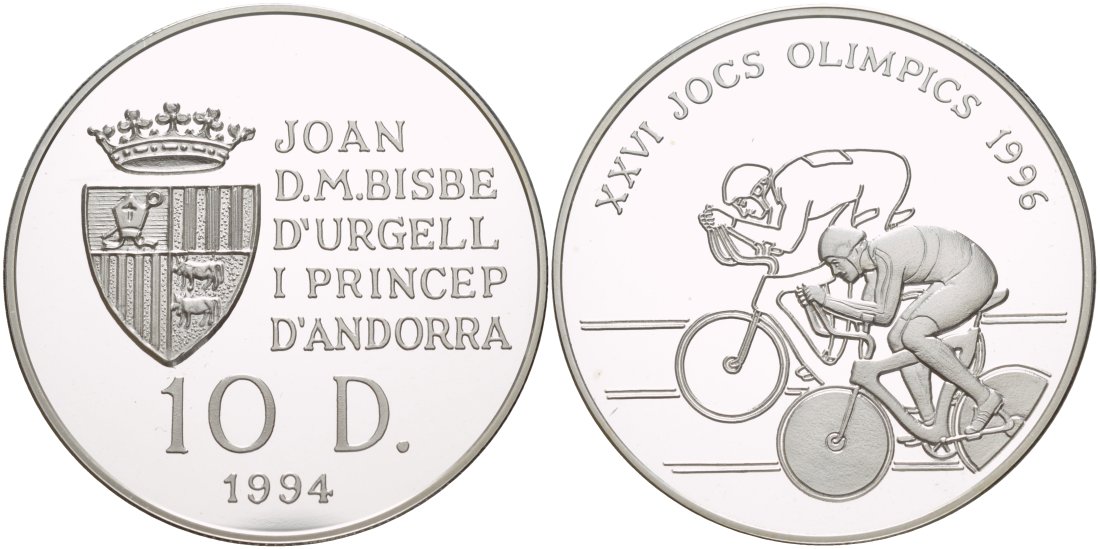 Андорра 10 динеров 1994 XXVI Олимпийские игры 1996 года велоспорт KM 95 серебро PROOF 1088-9-11