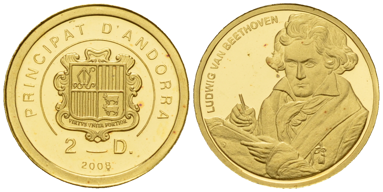 Андорра 2 динера 2008 Людвиг ван Бетховен KM 269 золото PROOF 00-801-29