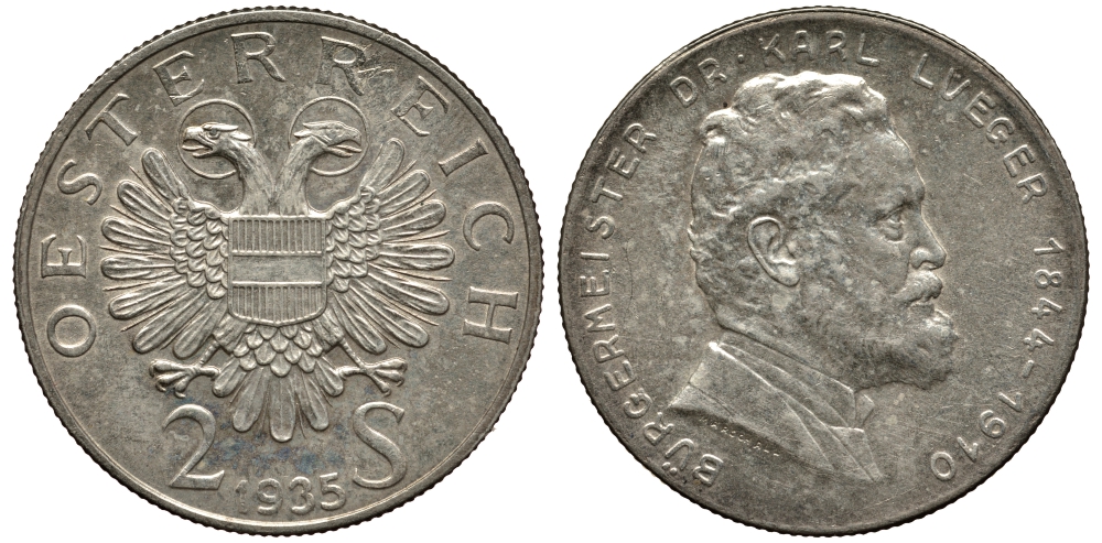 АВСТРИЯ 2 ШИЛЛИНГА 1935 КАРЛ ЛЮГЕР KM 2855 серебро 413-1231
