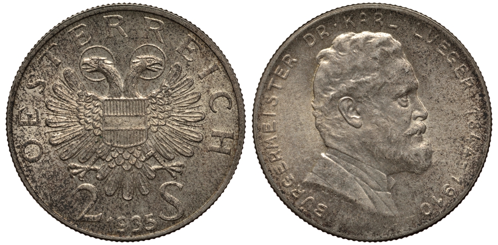 АВСТРИЯ 2 ШИЛЛИНГА 1935 КАРЛ ЛЮГЕР KM 2855 серебро 413-1422