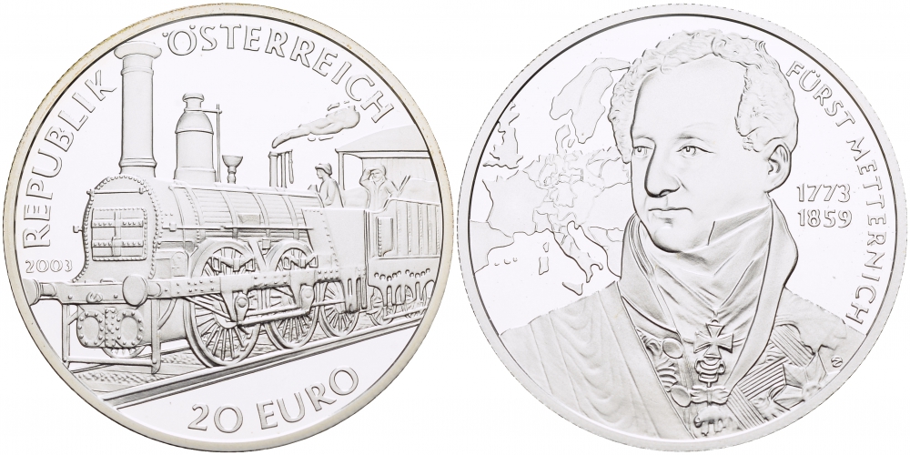 Австрия 20 евро 2003 ПАРОВОЗ, ПРИНЦ МЕТТЕРНИХ (1773-1859) KM 3104 серебро PROOF 1087-3-73