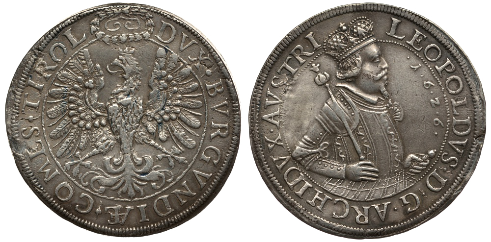 АВСТРИЯ, СВЯЩЕННАЯ РИМСКАЯ ИМПЕРИЯ, ТИРОЛЬ 2 ТАЛЕРА 1626 ДОМ ГАБСБУРГОВ, ЭРЦГЕРЦОГ ЛЕОПОЛЬД V ТИРОЛЬСКИЙ (1619-1632), МОНЕТНЫЙ ДВОР ХАЛЛ, ЦИФРЫ ДАТЫ ПЕРЕД ПОРТРЕТОМ, ВЕНОК НАД ГОЛОВОЙ ОРЛА БОЛЬШОЙ KM 807.2, Davenport 3336 серебро 00-000-00