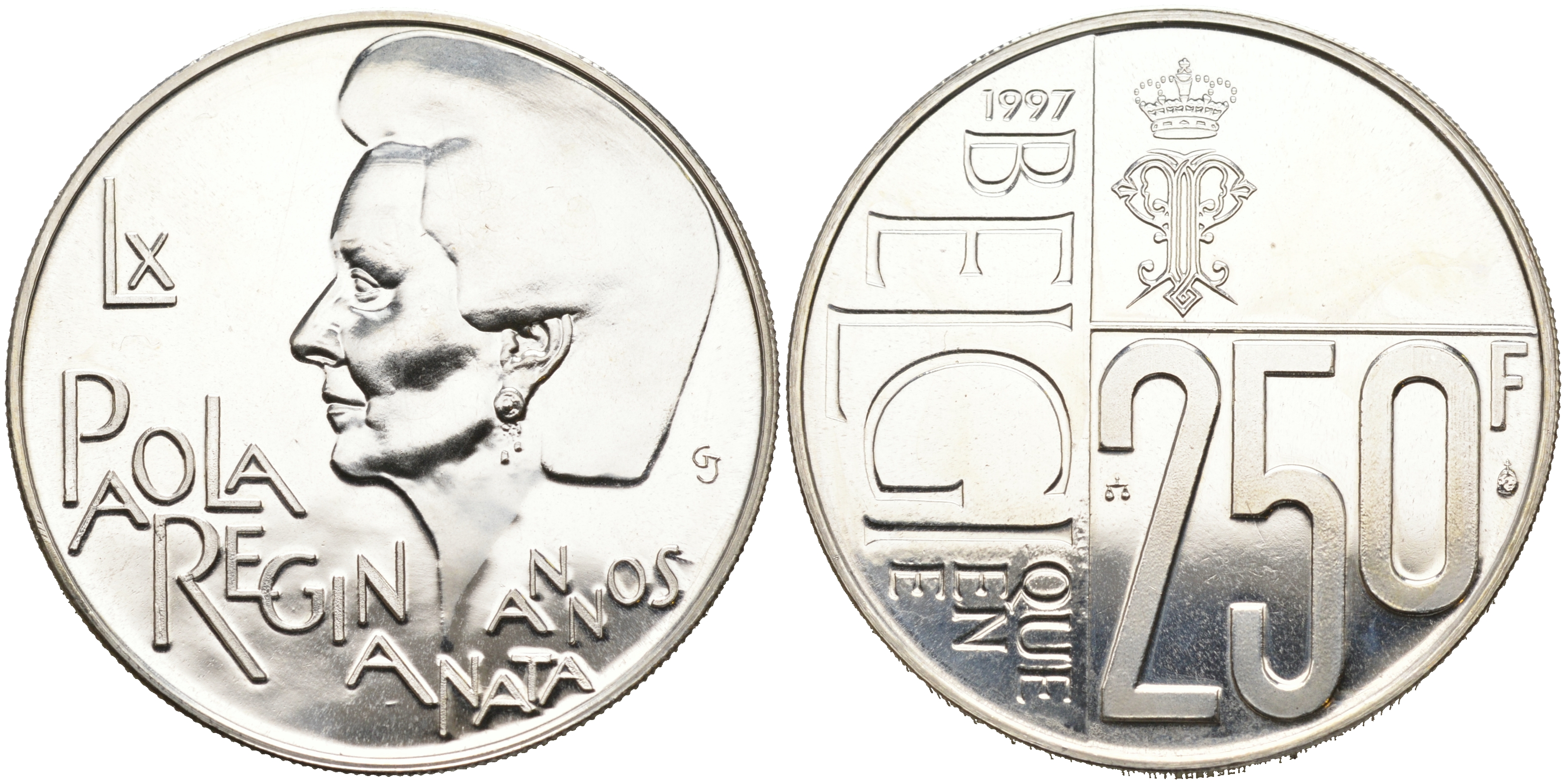 БЕЛЬГИЯ 250 ФРАНКОВ 1997 60 ЛЕТ КОРОЛЕВЕ ПАОЛЕ KM 207 серебро UNC 1096-2-41