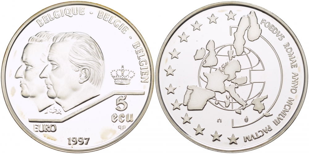 Бельгия 5 экю 1997 40 лет Римскому договору, портреты Альберта II и Бодуэна KM 205 серебро PROOF 1068-4-33