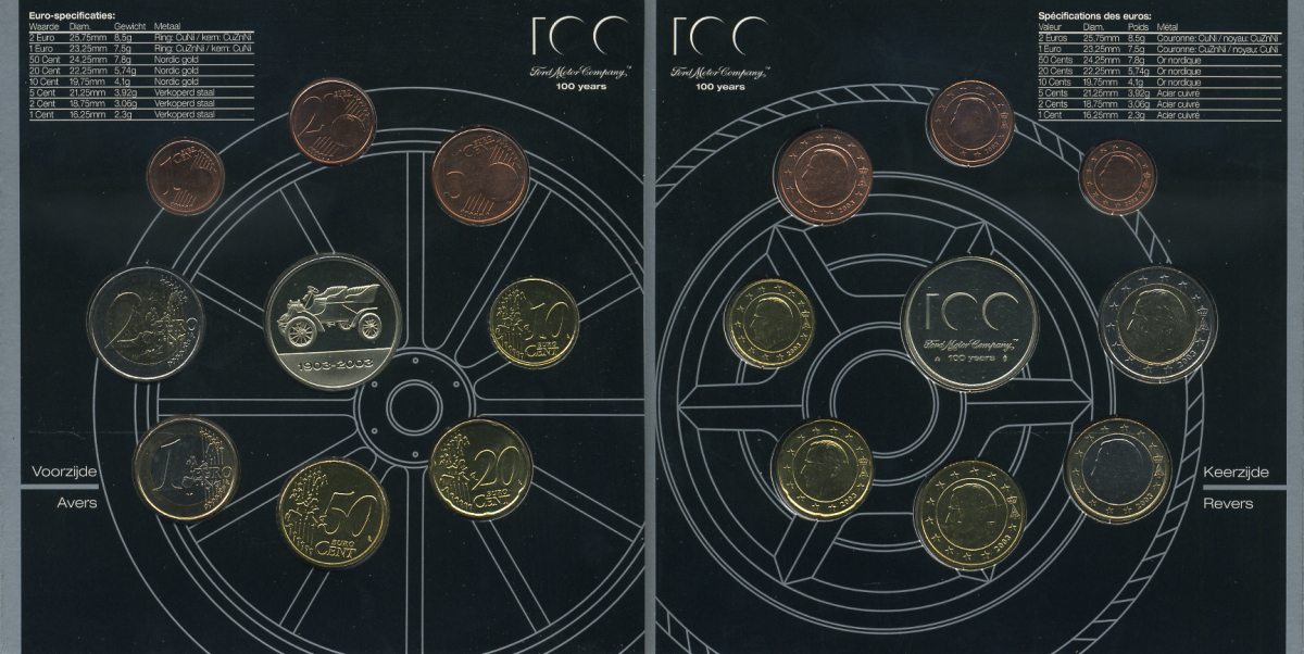 Бельгия евронабор из 8 монет + жетон 2003 100 лет фирме Форд, производителю автомобилей, в оригинальном буклете UNC 1-5-3-8
