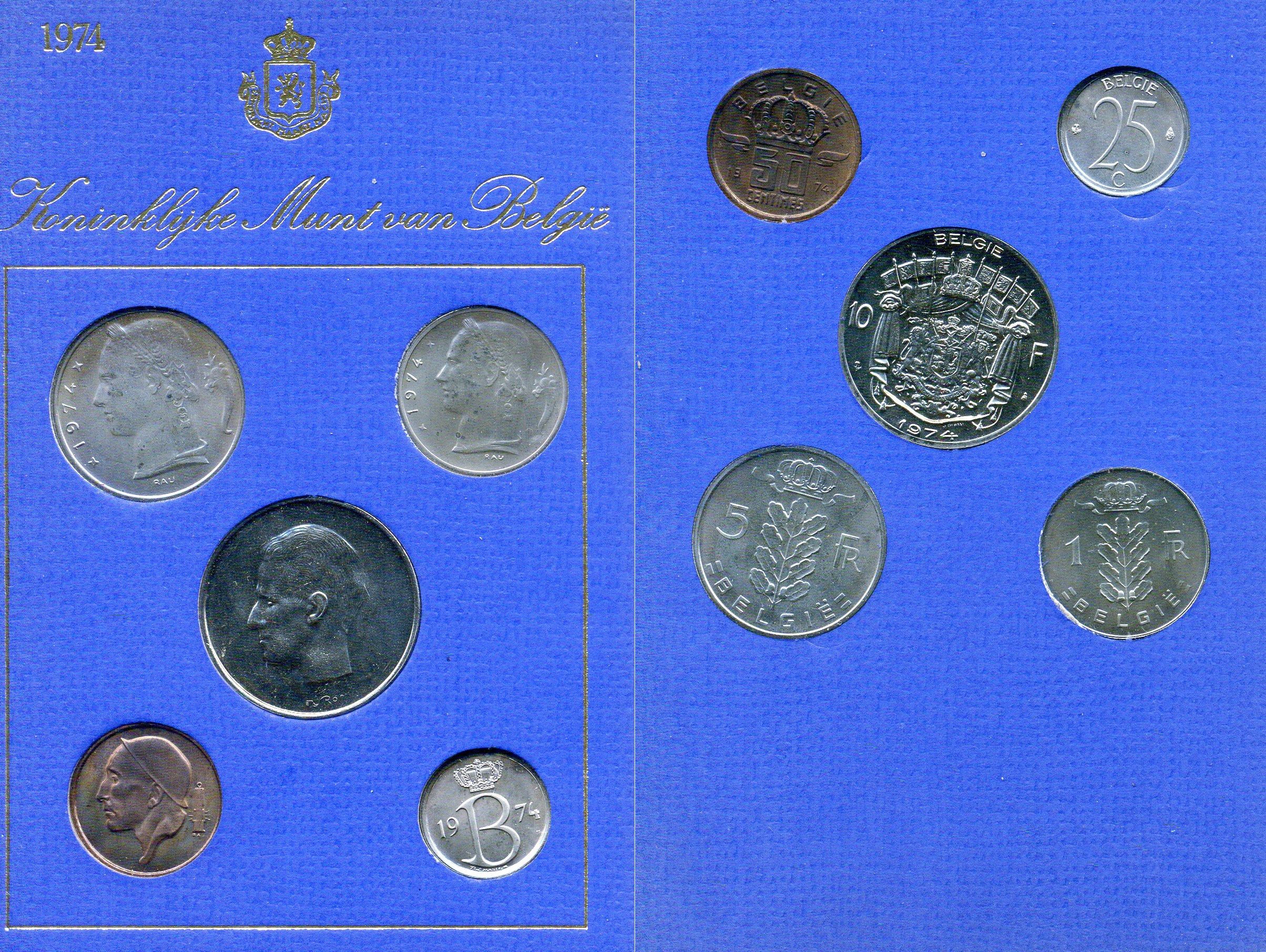 -----Бельгия набор из 5 монет (25 и 50 сантимов; 1, 5 и 10 франков) 1974 Belgie, в оригинальном буклете мондвора KM SS9 (135.1, 143.1, 149.1, 154.1 и 156.1) UNC 8-2-05-86