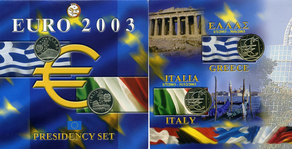 Бельгия евронабор из 12 монет + 2 жетонА 2003 президентство в евросоюзе, 12 монет по 1 евро всех стран еврозоны, Греция 1.1.2003 - 30.06.2003, Италия 1.07.2003 - 31.12.2003 UNC биметалл 5-4-5-27