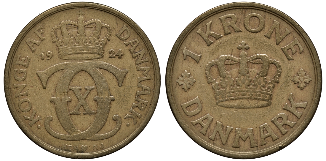 Дания 1 крона 1924 HCN, GJ, редкая KM 824.1 алюминиевая бронза 00-817-01
