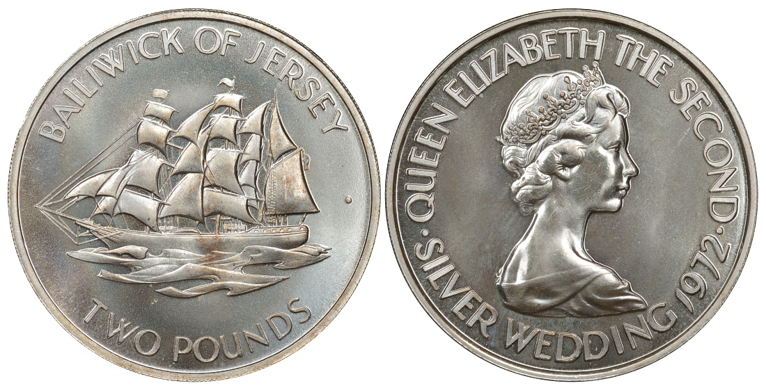 ДЖЕРСИ 2 ФУНТА 1972 25 ЛЕТ КОРОЛЕВСКОЙ СВАДЬБЕ, ПАРУСНИК KM 37 серебро UNC 1077-10-62