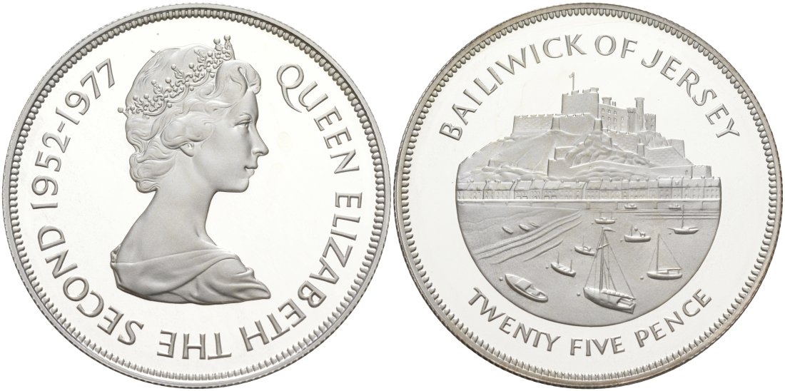 Джерси 25 пенсов 1977 25 лет правления Елизаветы II, в оригинальной коробке, с сертификатом KM 44а серебро PROOF 3-4-4-30