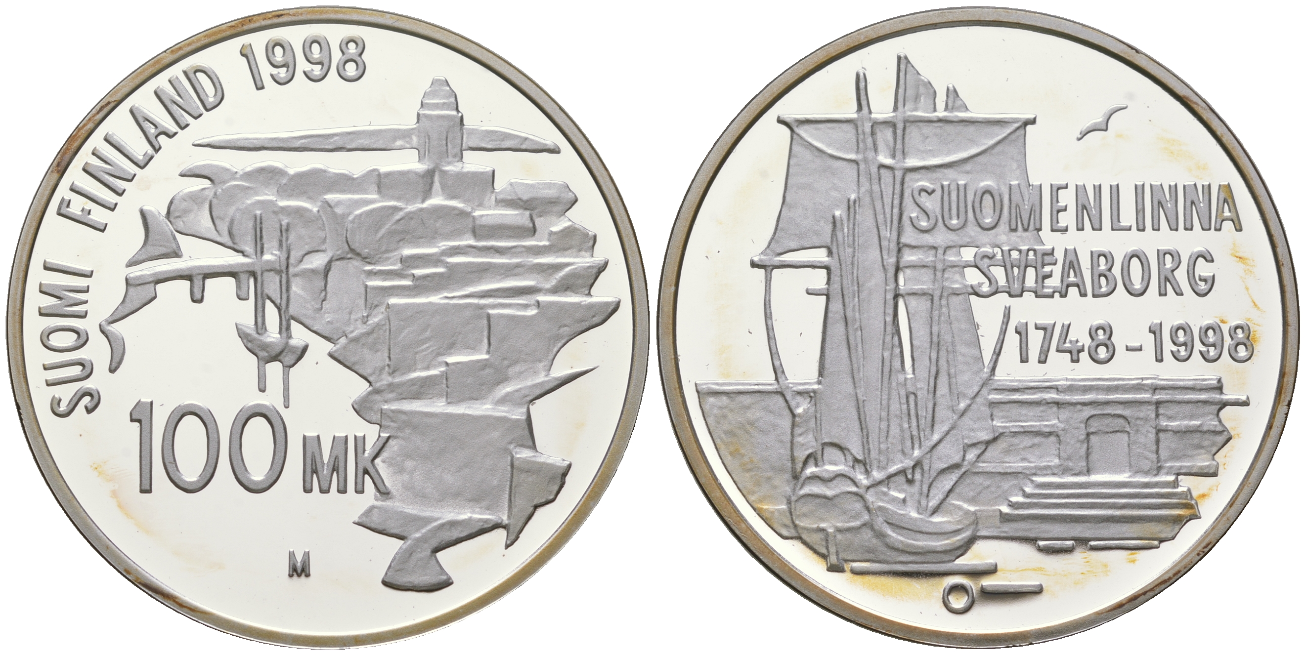 Финляндия 100 марок 1998 Свеаборг, бастионная система укреплений на островах близ Хельсинки, корабли, тираж 3300 экземпляров KM 88 серебро PROOF 1095-3-62