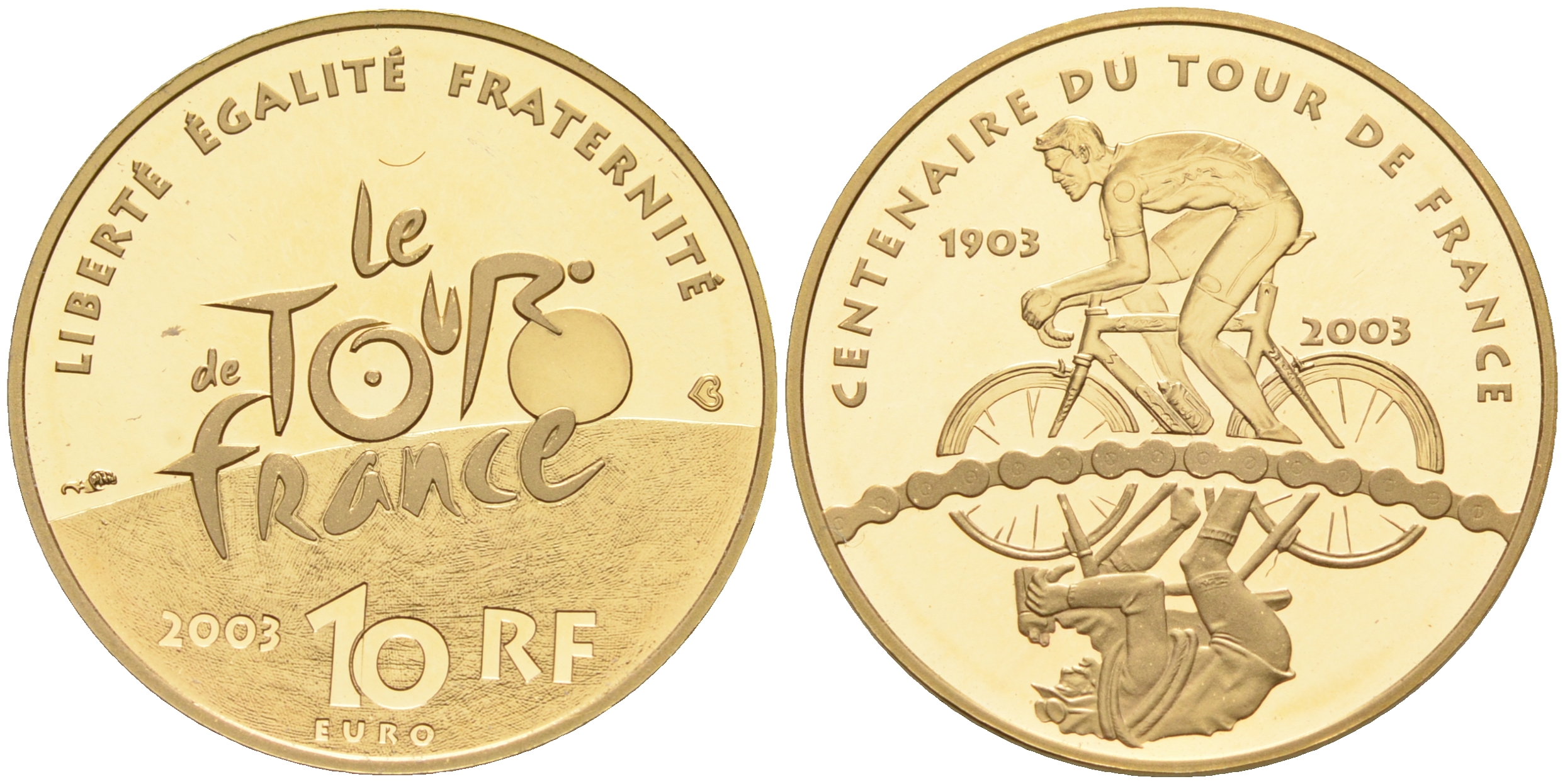 Франция 10 евро 2003 100 лет велогонкам Тур де Франс, велосипедист едет влево KM 1326 золото PROOF 00-811-07