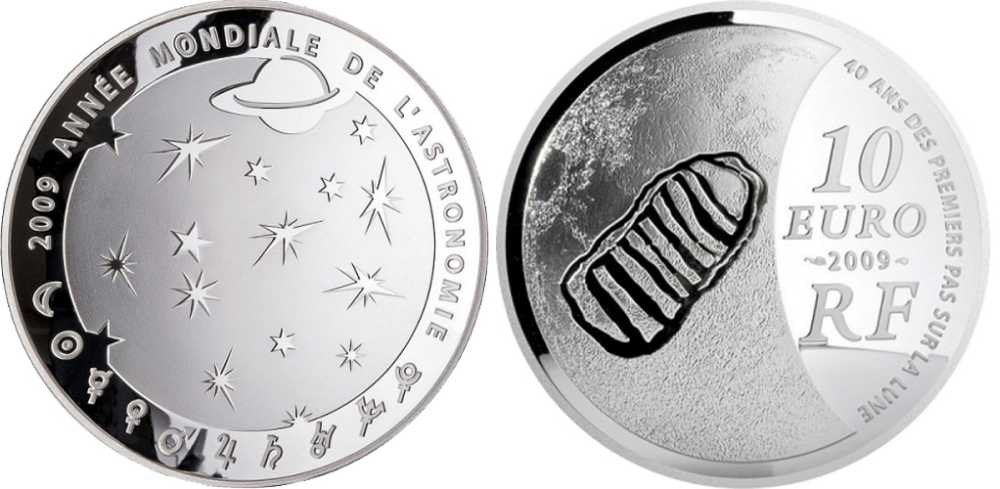 Франция 10 евро 2009 Международный год астрономии, 40 лет первой высадки на Луну, монета выпуклой формы, след астронавта на Луне, тираж 10000 экз. 4-3-3-29