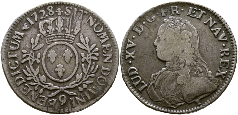 ФРАНЦИЯ 1 ЭКЮ 1728 9, ЛЮДОВИК XV KM 486.26 (С42,27) серебро 603-1344