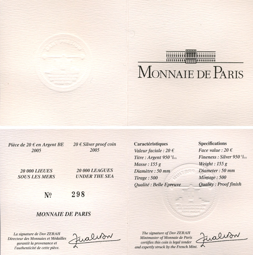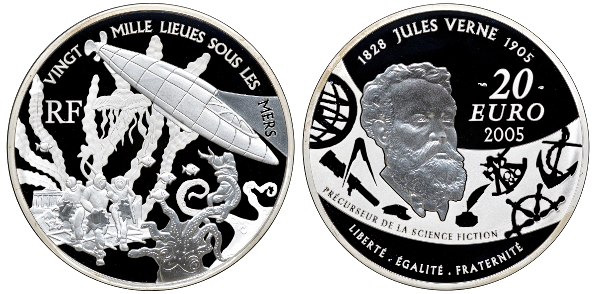 Франция 20 евро 2005 Жюль Верн 20000 лье под водой 155 гр. серебро PROOF 00-000-00