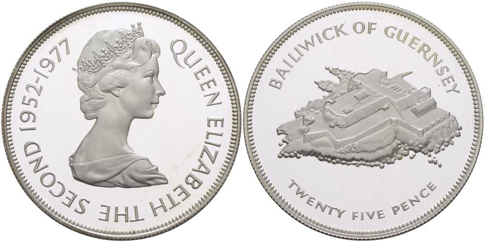 Гернси 25 пенсов 1977 25 лет правления Елизаветы II, крепость, в оригинальной коробке, с сертификатом, тираж 25000 экземпляров KM 31а серебро PROOF 6-5-3-32