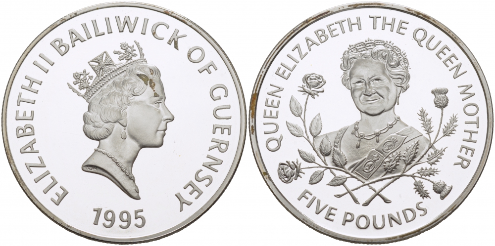 Гернси 5 фунтов 1995 КОРОЛЕВА МАТЬ KM 66a серебро PROOF 1077-9-53