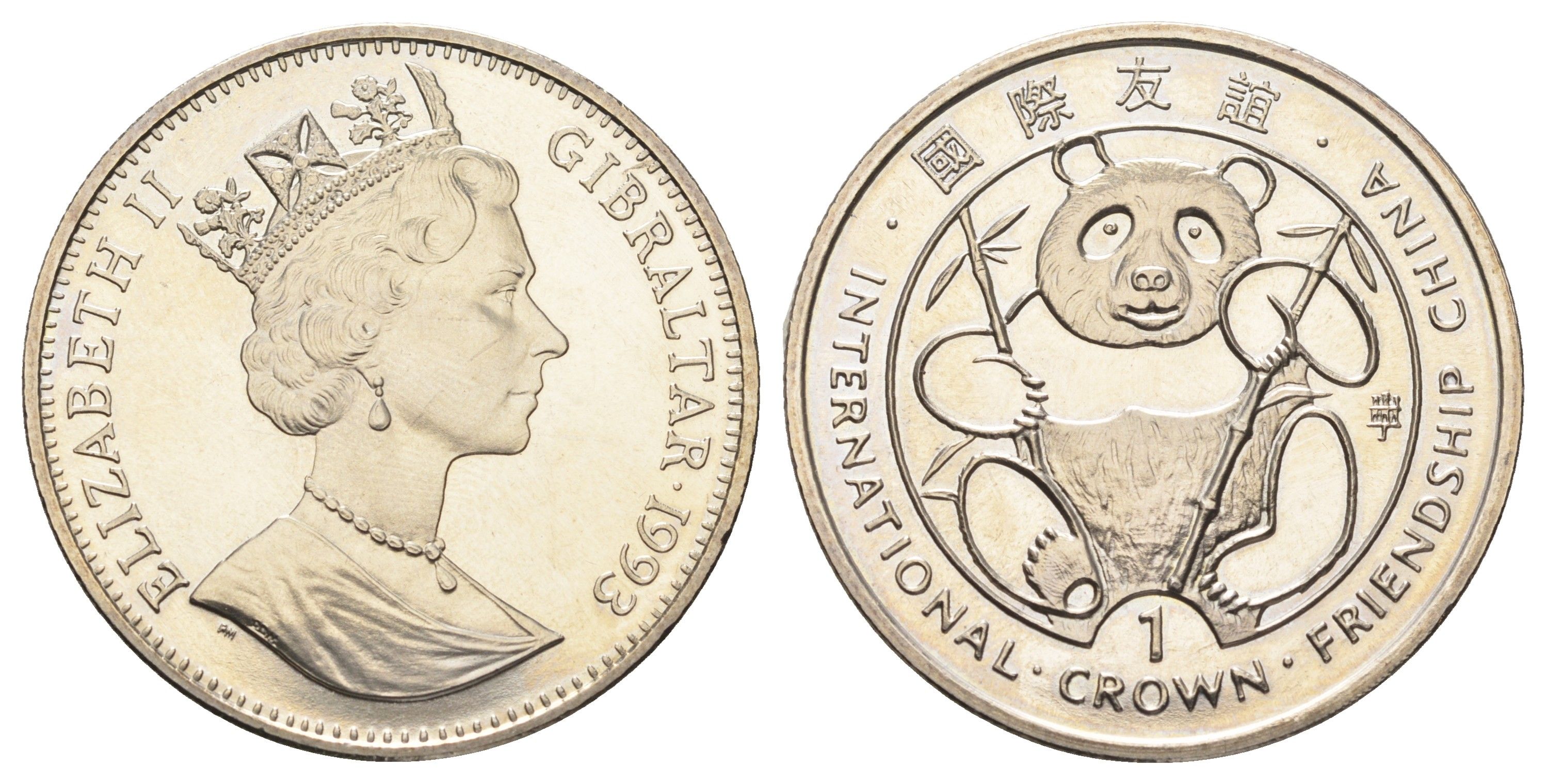Гибралтар 1 крона 1993 Международная дружба с Китаем, панда KM 180 медно-никель BU 1524-1712
