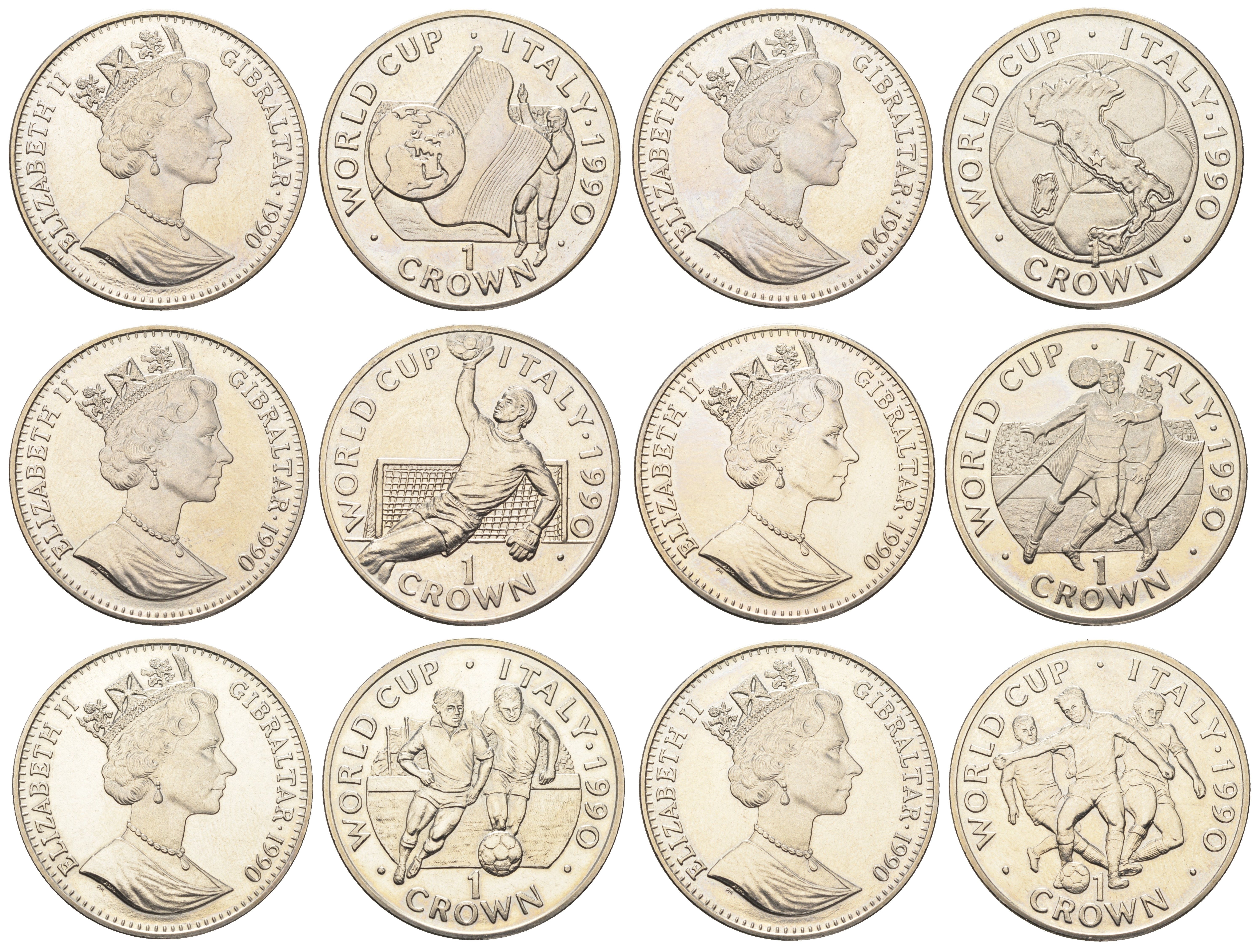 Гибралтар полный набор из 6 монет (1 крона) 1990 Чемпионат мира по футболу 1990 KM 33, 34, 35, 36, 37 и 38 медно-никель BU 1524-1525-1535
