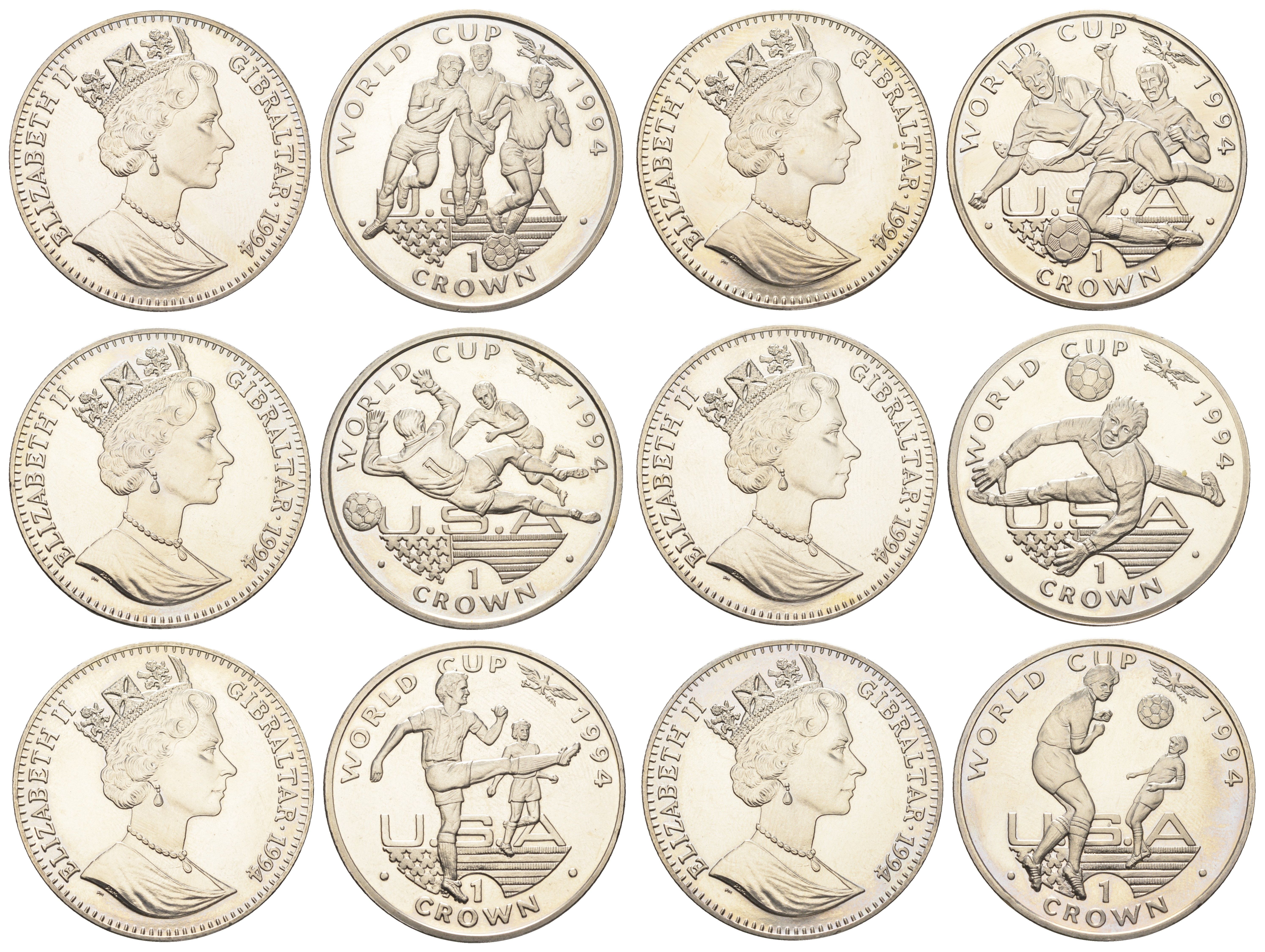 Гибралтар полный набор из 6 монет (1 крона) 1994 Чемпионат мира по футболу 1994 KM 225, 227, 229, 231, 233 и 235 медно-никель BU 1524-1715-1725