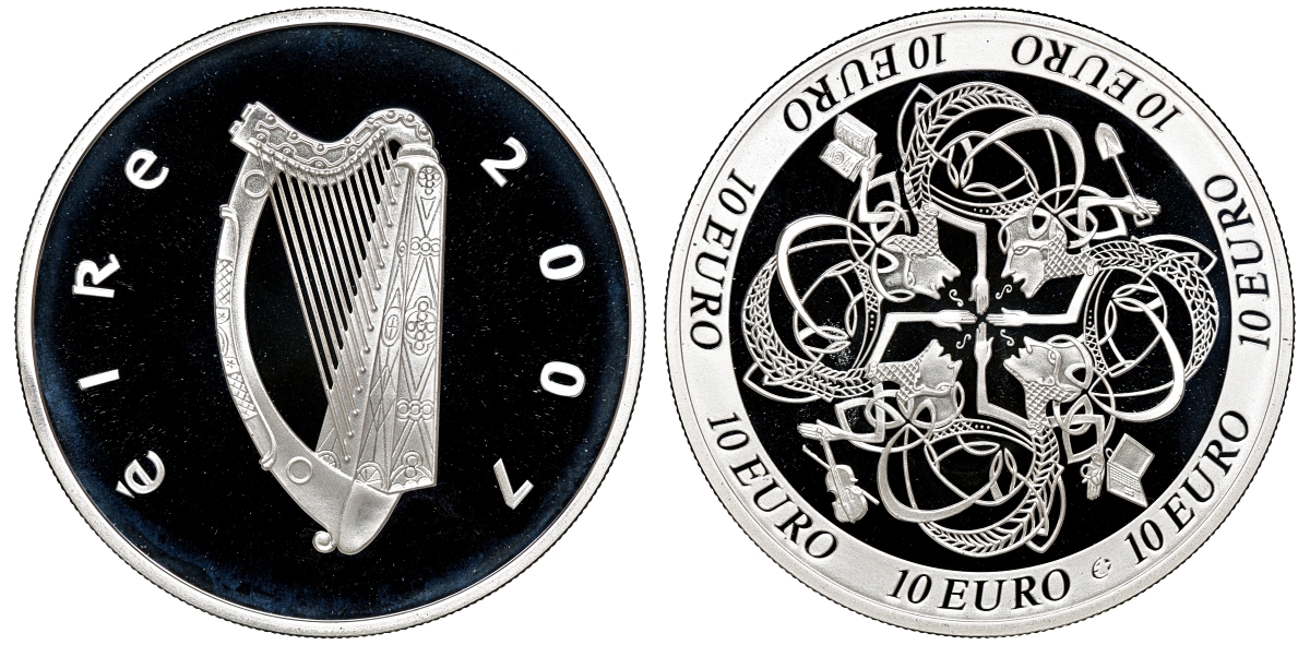 Ирландия 10 евро 2007 влияние Ирландии на европейскую культуру, символы влияния в 4-х областях культуры KM 58 серебро PROOF 4-3-4-23