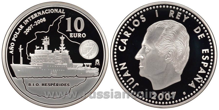 -----Испания 10 евро 2007 Международный полярный год, корабль Био Гесперидес, в оригинальной коробке с сертификатом KM 1140 серебро PROOF 5-1-54