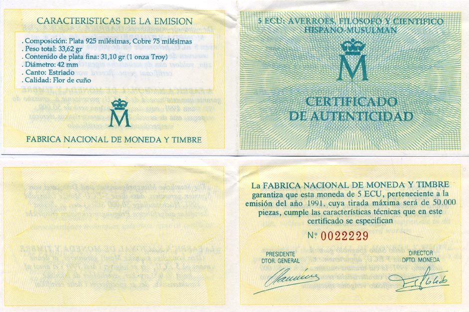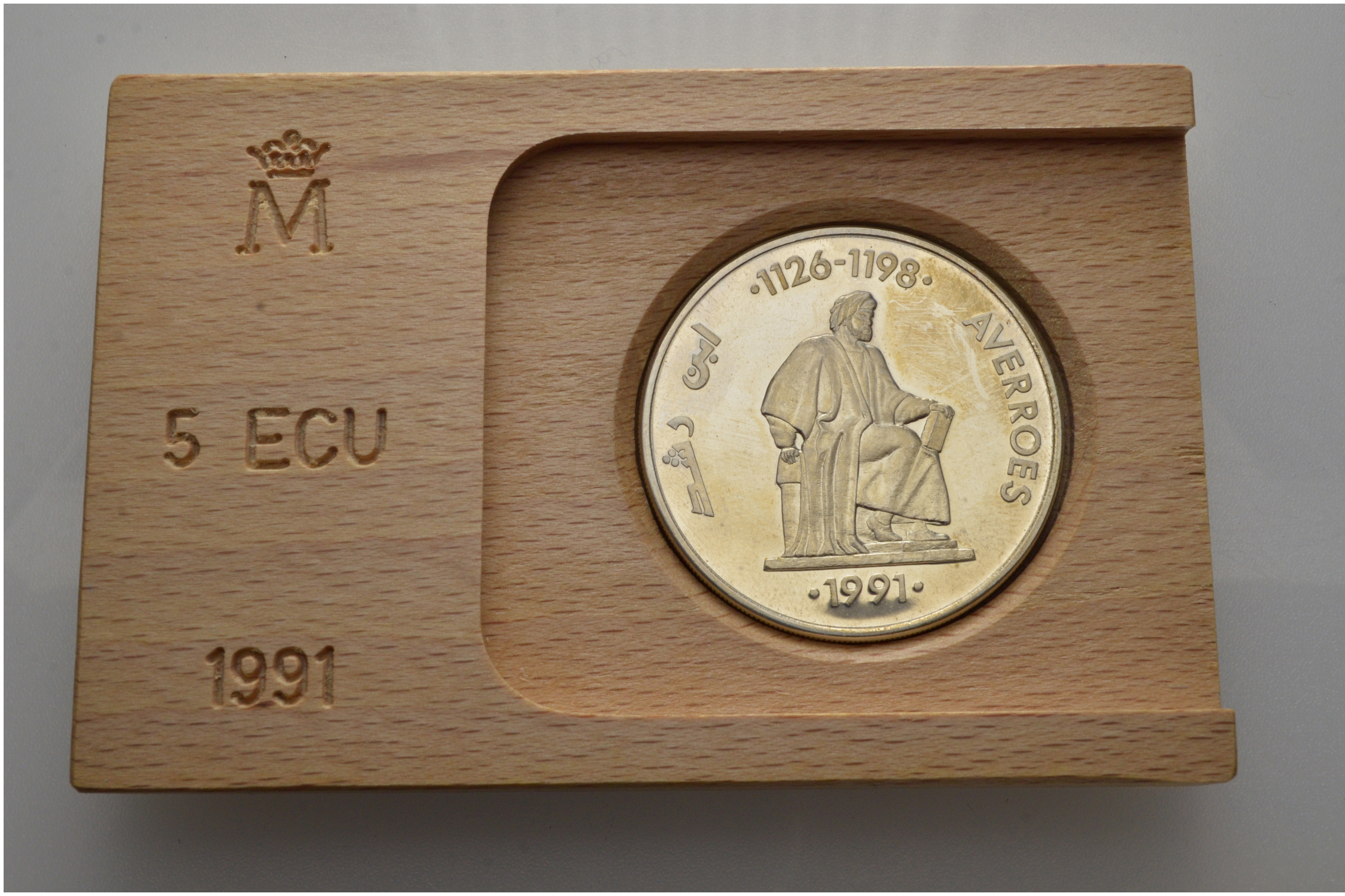 -----Испания 5 экю 1991 Аверроэс (Ибн Рушд) западно-арабский философ (1126-1198), в оригинальной деревянной коробке, с сертификатом серебро PROOF 4-3-1-12