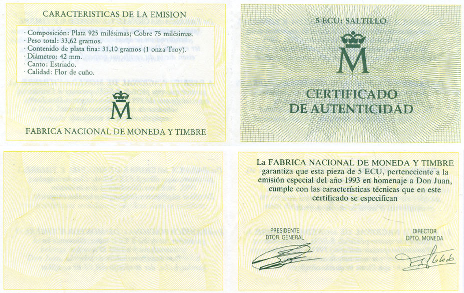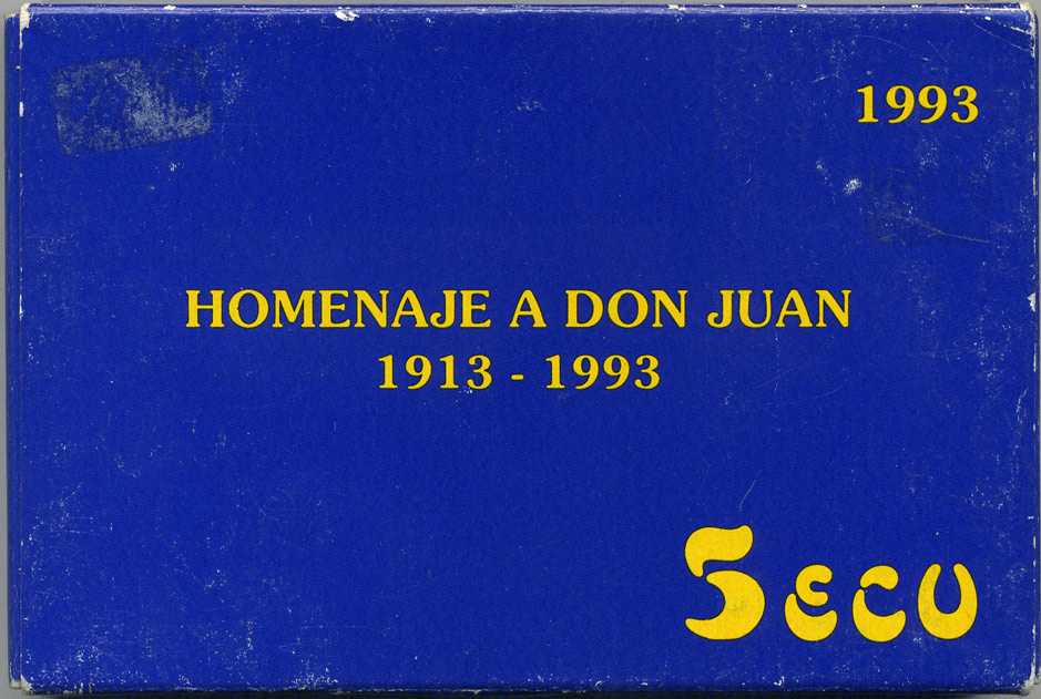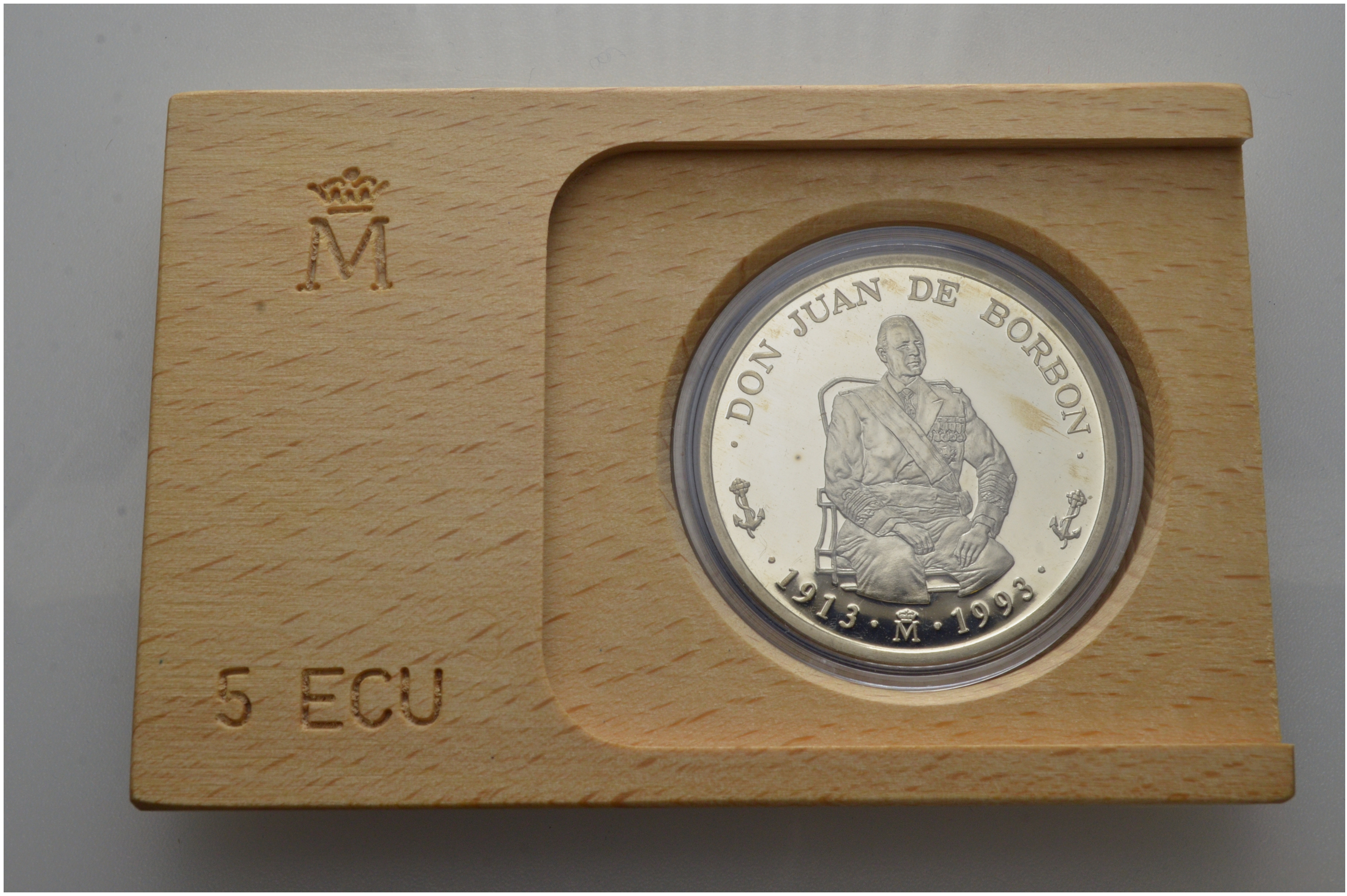 -----Испания 5 экю 1993 Хуан Карлос I (1913-1993), парусник, в оригинальной деревянной коробке, с сертификатом серебро PROOF 4-3-1-14