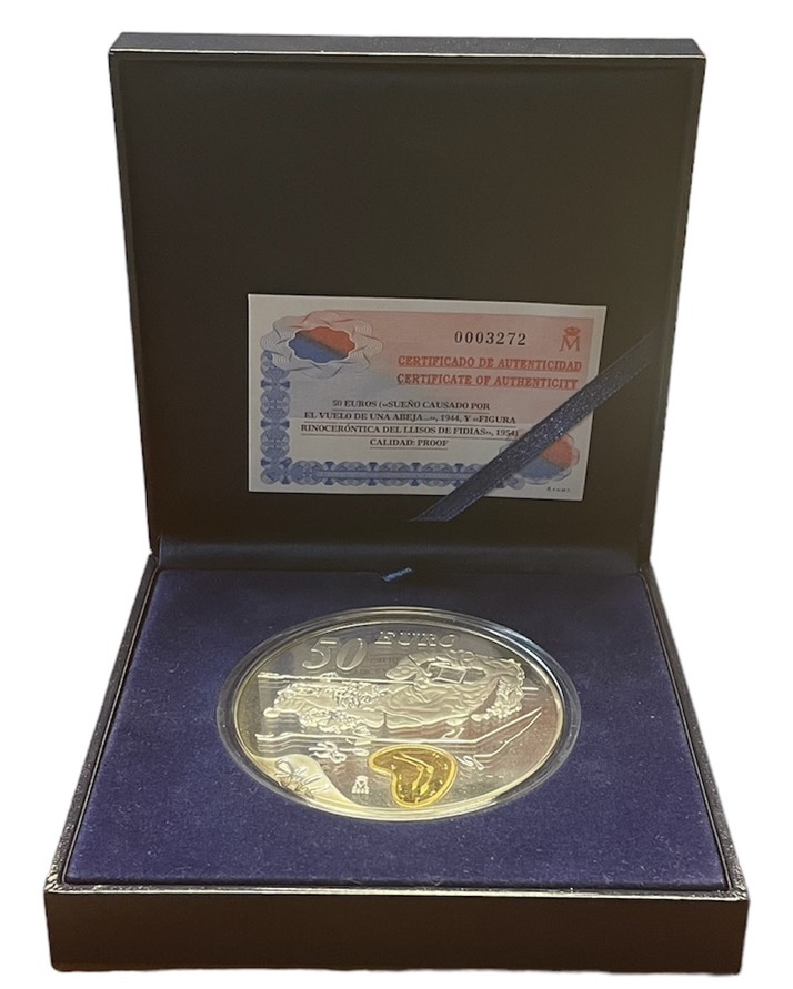 Испания 50 евро 2004 Сальвадор Дали, "За секунду до пробуждения", "Мягкий автопортрет с жареным беконом", позолота, коробка, сертификат КМ 1057 серебро PROOF 6-5-1-20