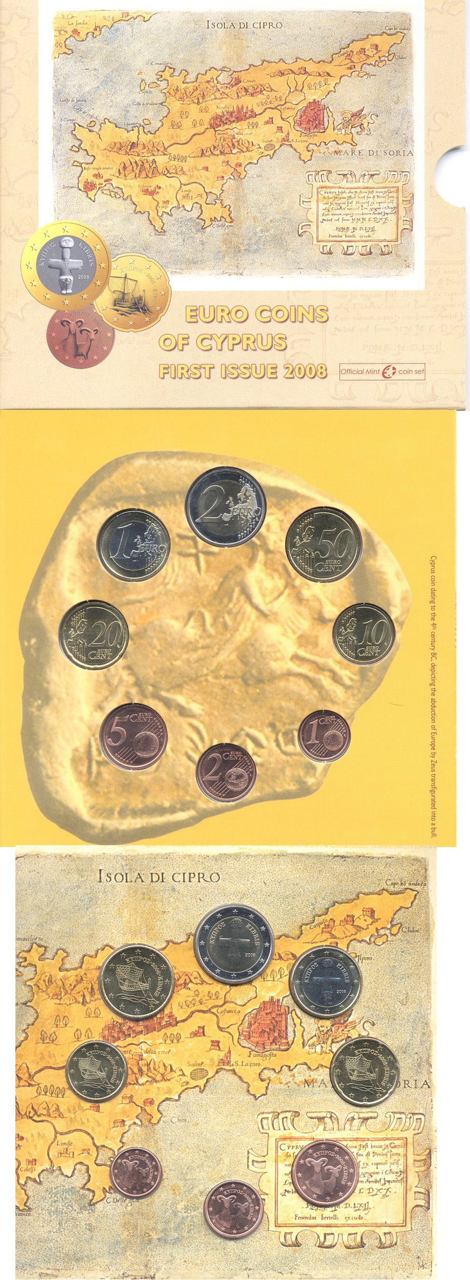 Кипр евронабор из 8 монет 2008 первый набор Кипра после вступления в еврозоны, в буклете биметалл UNC 7-6-1-23