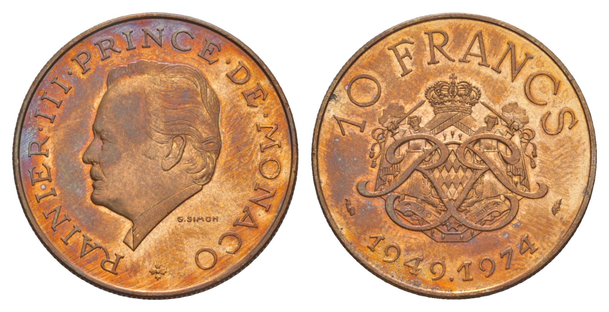 Монако 10 франков 1974 25 лет правления Князя Ренье III KM 151 медь алюминий никель UNC 1527-1114