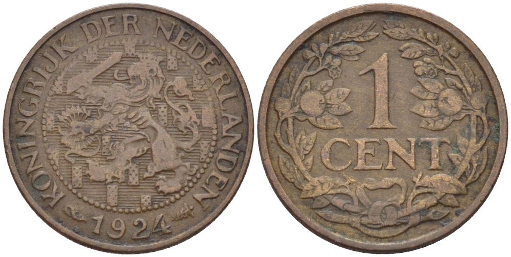 НИДЕРЛАНДЫ 1 ЦЕНТ 1924 ВИЛЬГЕЛЬМИНА (1890-1948), РЕДКИЙ ГОД KM 152 бронза 100-826