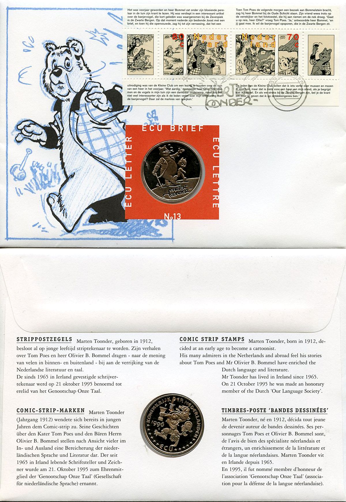 Нидерланды 1 экю 1996 Мартен Тунда, в оригинальном конверте, с марками, первый день гашения X 213 медно-никель BU 4-3-8-09
