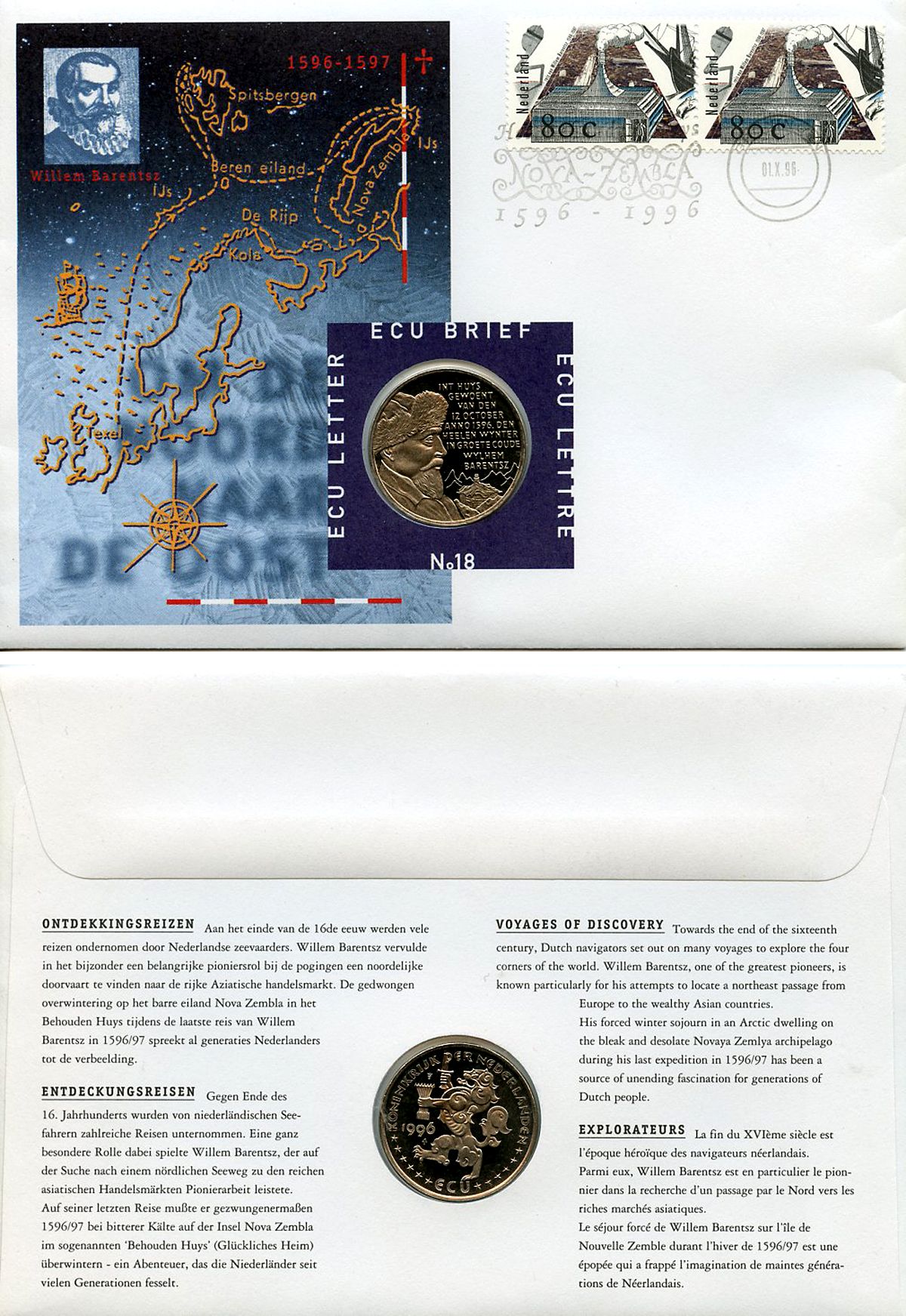 Нидерланды 1 экю 1996 Открытия, в оригинальном конверте, с марками, первый день гашения X 218 медно-никель BU 4-3-8-10