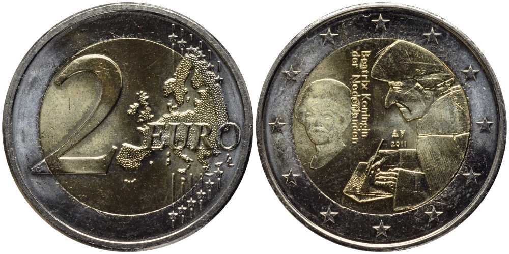 Нидерланды 2 евро 2011 500 лет издания книги «Похвала глупости» Эразма Роттердамского KM 298 биметалл BUNC 114-935