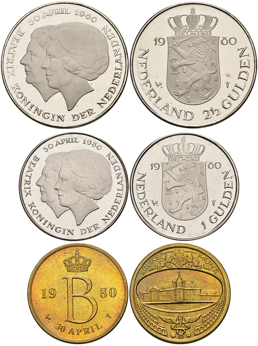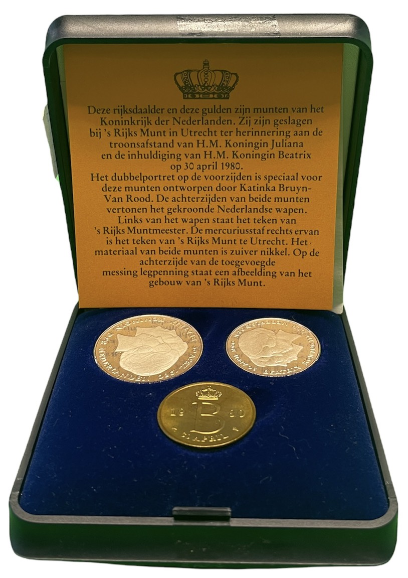 Нидерланды набор из 2 монет = жетон монетный двора 1980 официальный коронационный жетон жетон, коробка, сертификат KM PSK27 (KM200-2001) никель UNC 4-4-1-11