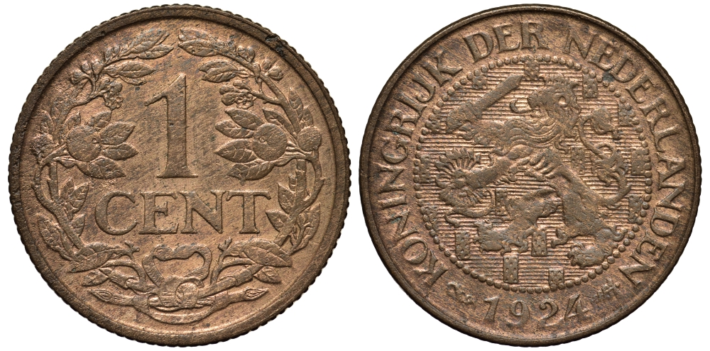 Нидерланды 1 цент 1924 Вильгельмина (1890-1948), редкий год KM 152 бронза 443-524