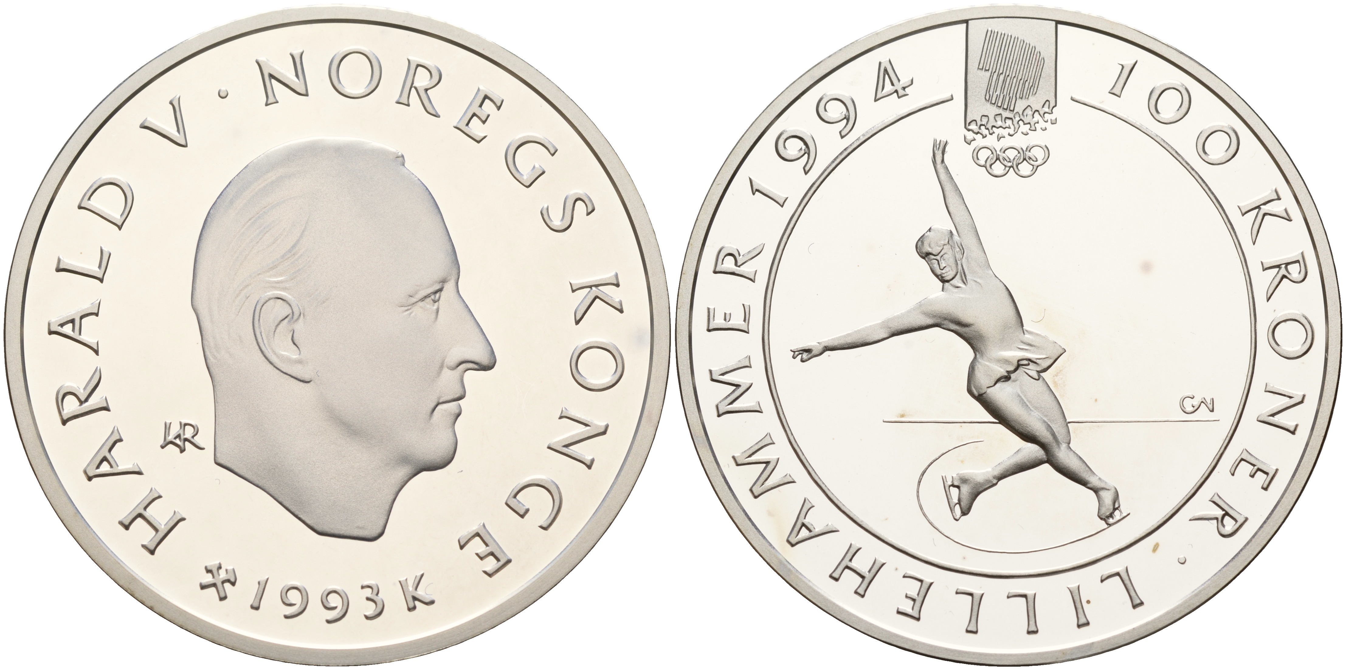 Норвегия 100 крон 1993 зимние Олимпийские игры 1994 года в Лиллехаммере, фигурное катание KM 449 серебро PROOF 01-234-51