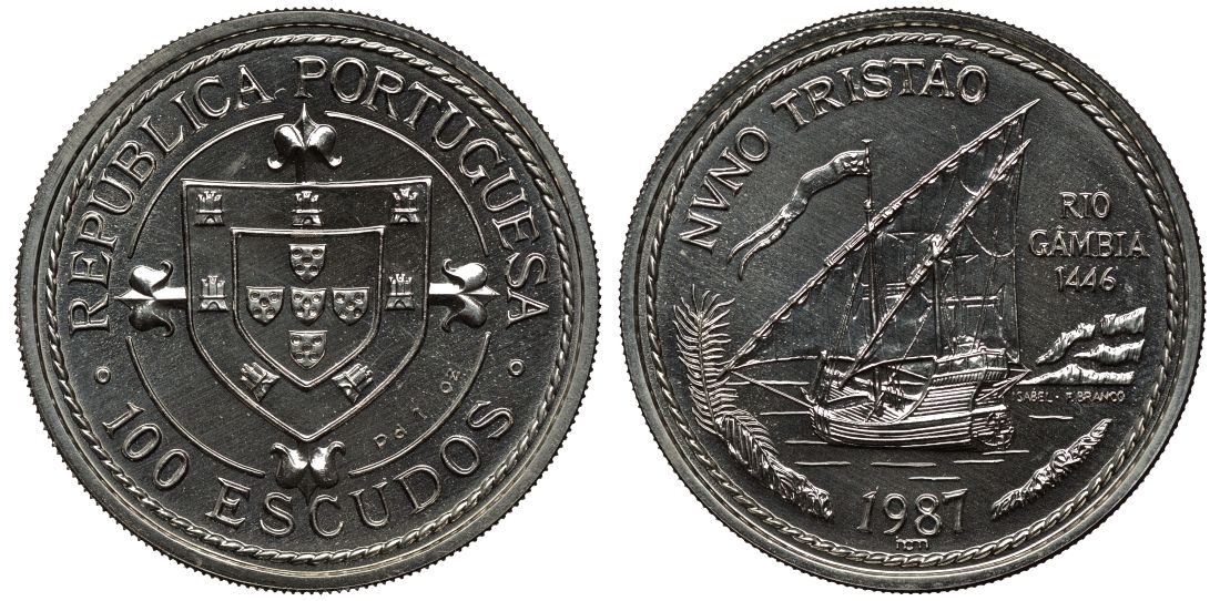 Португалия 100 эскудо 1987 Золотой век Португальских открытий, Нуно Тристао, тираж 323 экземпляра Fr-159a, KM 640c палладий UNC 10-020-35