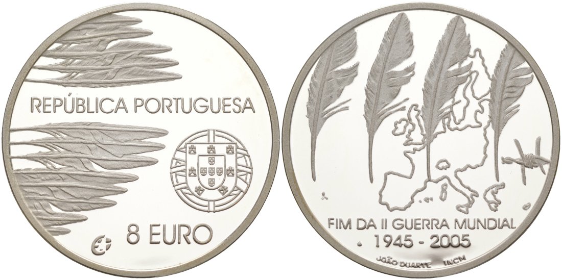 Португалия 8 евро 2005 60 лет окончания 2-ой мировой войне KM 773а серебро PROOF 01-345-25