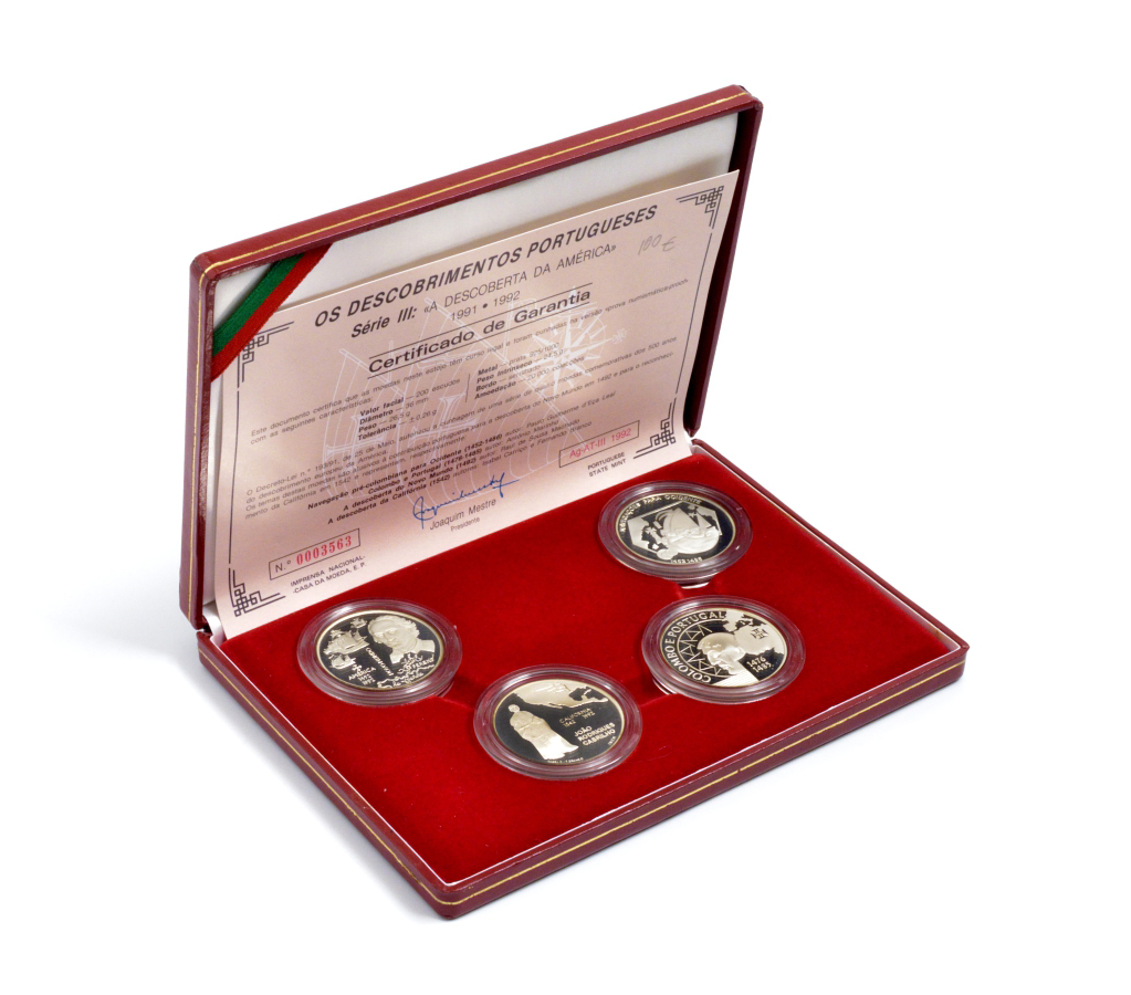 Португалия набор из 4 монет по 200 эскудо 1992 Великие Португальские открытия, серия III, сертификат, коробка KM 658a, 659a, 660a, 661a серебро PROOF 1-4-6-13