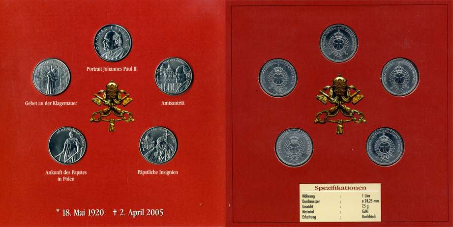 Мальтийский Орден набор из 5 монет по 1 лире 2005 на смерть Папы Иоанна Павла II (18 мая 1920 - 2 апреля 2005), в картонном буклете медно-никель UNC 00-00