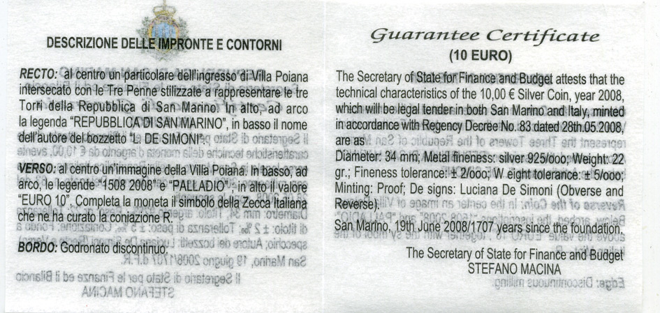 Сан-Марино 10 евро 2008 500 лет Андреа Палладио, в оригинальной коробке, сертификат KM 514 серебро PROOF 2-4-2-13