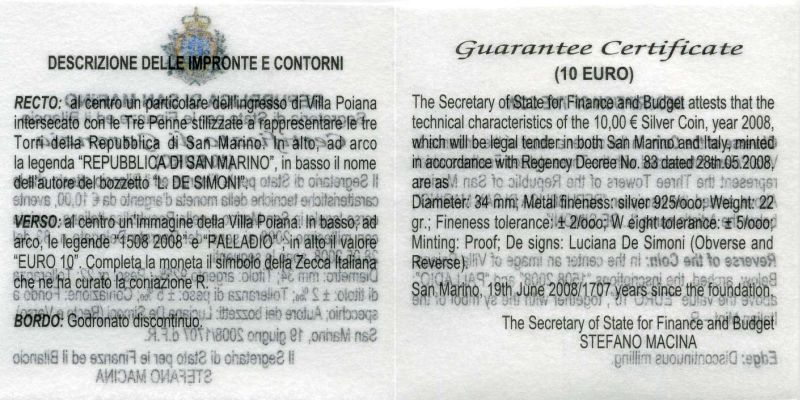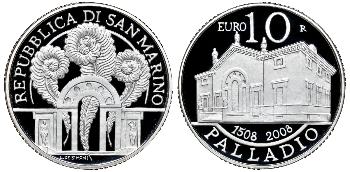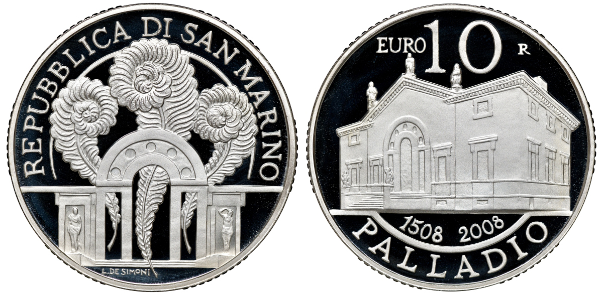Сан-Марино 10 евро 2008 500 лет Андреа Палладио, в оригинальной коробке, сертификат KM 514 серебро PROOF 4-3-4-37