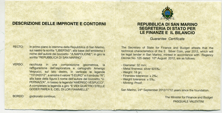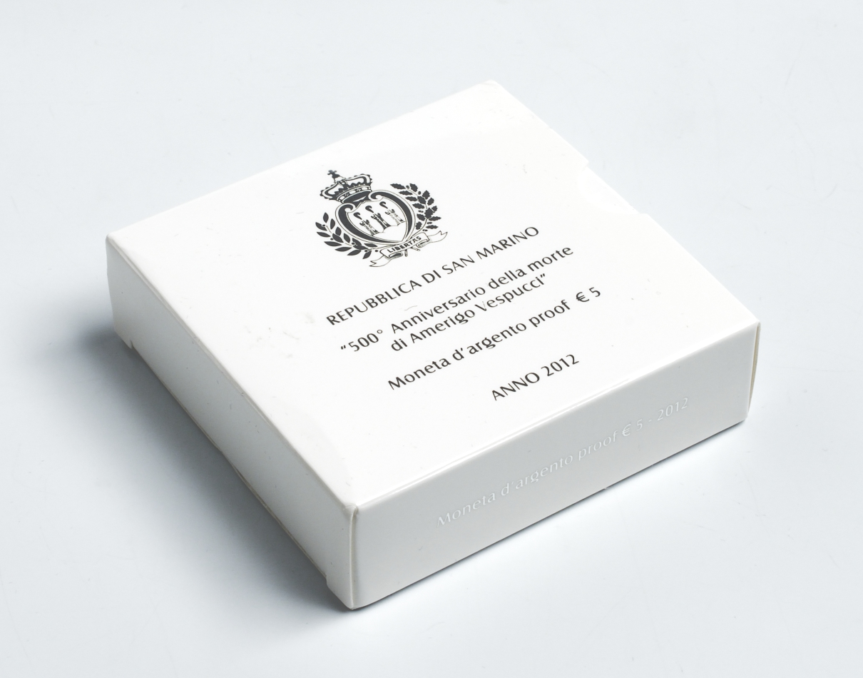 Сан-Марино 5 евро 2012 500 лет со дня смерти Америго Веспуччи, коробка, сертификат SM 160 серебро PROOF 2-5-2-6