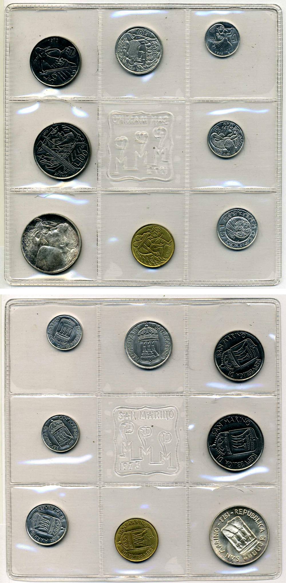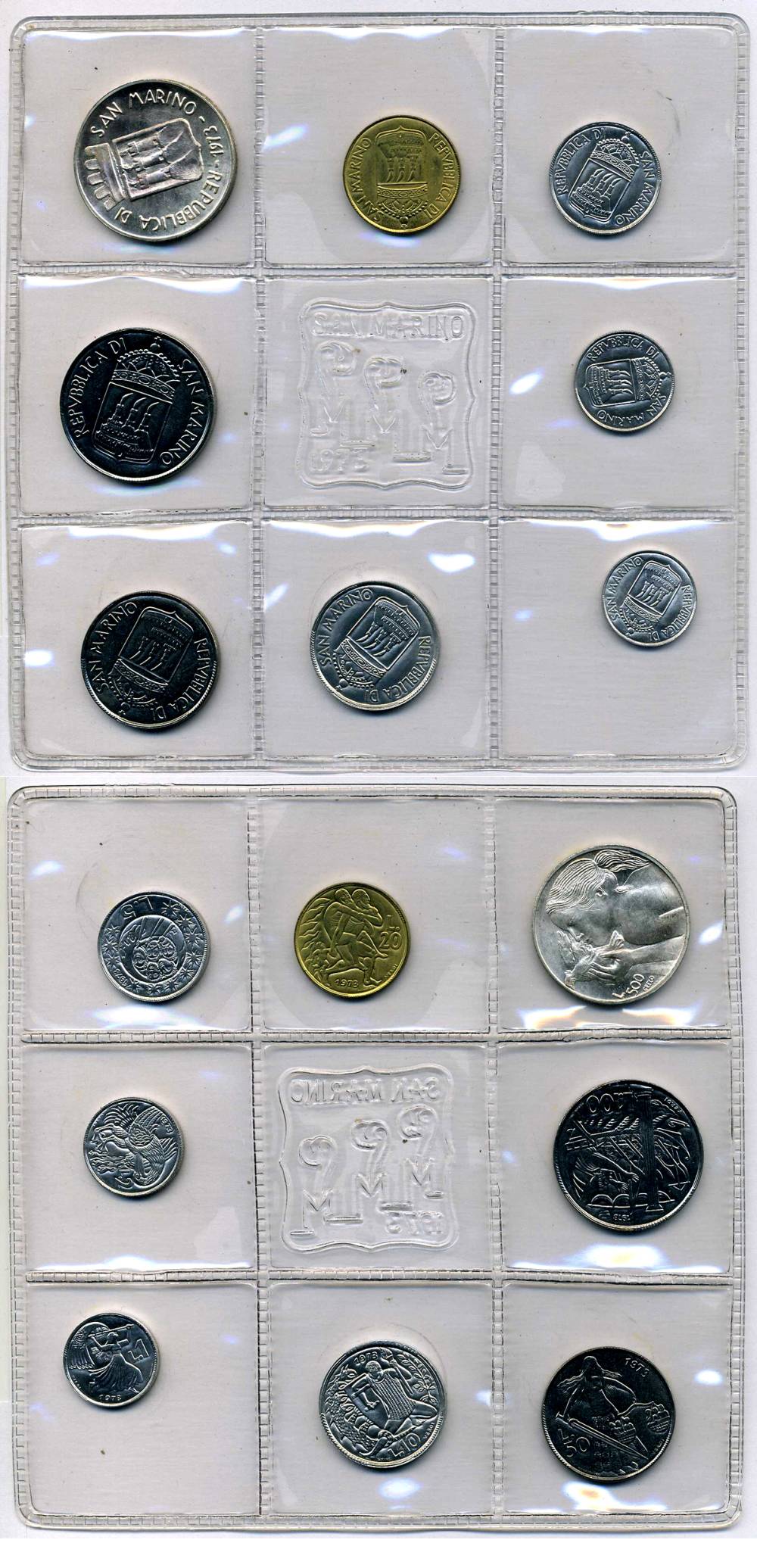 Сан-Марино годовой набор из 8 монет 1973 1, 2, 5, 10, 20, 50, 100 и 500 лир ребёнок держит голубя KM 22-29, в оригинальной пластиковой запайке серебро KM MS2 серебро UNC 3-4-5-16